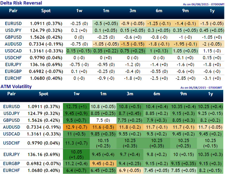 - Delta risk reversals of EURCHF for next 6 months: EURCHF bid for calls distorted after the temporary resolution of Greece issue helped by a similar move in other EUR crosses and are currently hovering near the post-crisis lows. After the move to 1.0593, the OTC options market appeaed to be more balanced on the direction for the pair over the 1m to 1y time horizon and as a result delta risk reversal for EURCHF was turning into negative.