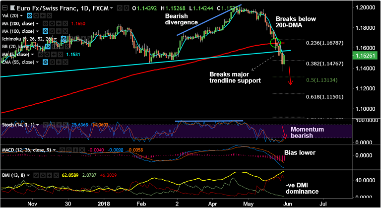 - EUR/CHF edges higher from 8-month lows at 1.1368, trades 0.55% higher on the day.