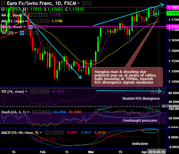 Despite hanging man and shooting star patterns pop up at peaks of rallies of EURCHF, bulls are hovering at 7DMAs, while bearish RSI divergence signals weakness.