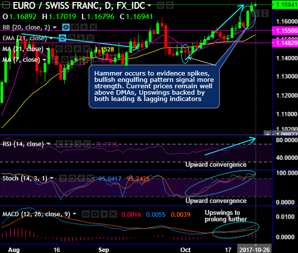 Before this, bulls are activated to bounce above DMAs ever since the occurrence of hammer pattern at 1.1433 levels. The current prices remain well above DMAs, and the upswings are backed by both leading & lagging indicators.