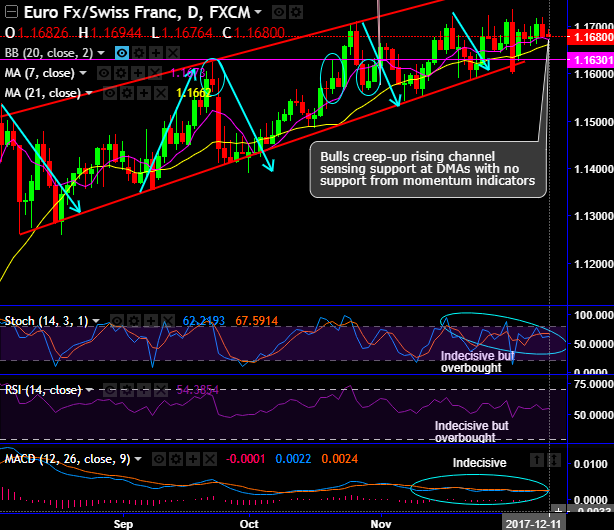 EURCHF short-term trend has been spiking through rising channel, while the bulls in the consolidation phase of the major trend have broken-out the long-lasting range bounded trend. Please observe that the pair has shown the considerable tides and troughs as and when the prices touch channel support and resistance respectively.