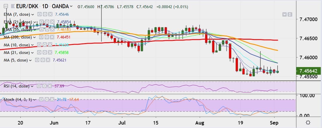 - EUR/DKK is currently trading up at 7.4564, having hit a high of 7.4578 earlier, its highest since August 27.