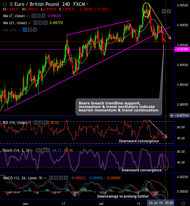 EURGBP bears extend minor downtrend upon breach below the uptrend line, although bulls attempt to bounce in the previous trading session, the renewed weakness is observed for today (refer 4H chart). Shooting star and hanging man have occurred at the peaks of rallies at 0.9029 and 0.9035 levels respectively to signal weakness.