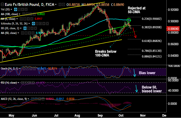 - EUR/GBP is extending weakness after rejection at 50-DMA in previous week's trade.