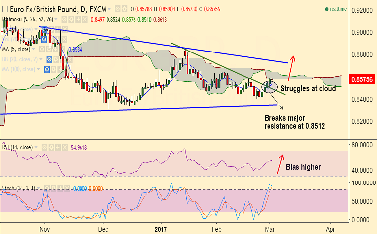 Resistance levels - 0.8578 (cloud top), 0.8610 (100-DMA), 0.8634 (Jan 31 high)