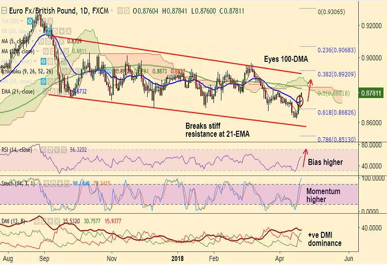 - EUR/GBP breaks above 21-EMA, hits 2-week highs of 0.8784, bias higher.