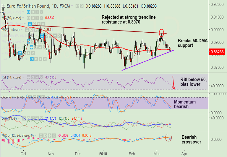- The pair has broken support at 50-DMA at 0.8839, raising scope for further downside.