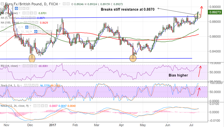 - EUR/GBP has broken out of major channel top resistance at 0.8870, bias higher.