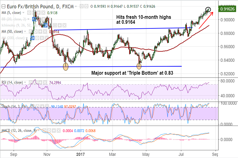 - EUR/GBP hits fresh 10-month highs at 0.9164. Euro on rampage ahead of this week's Jackson Hole symposium.