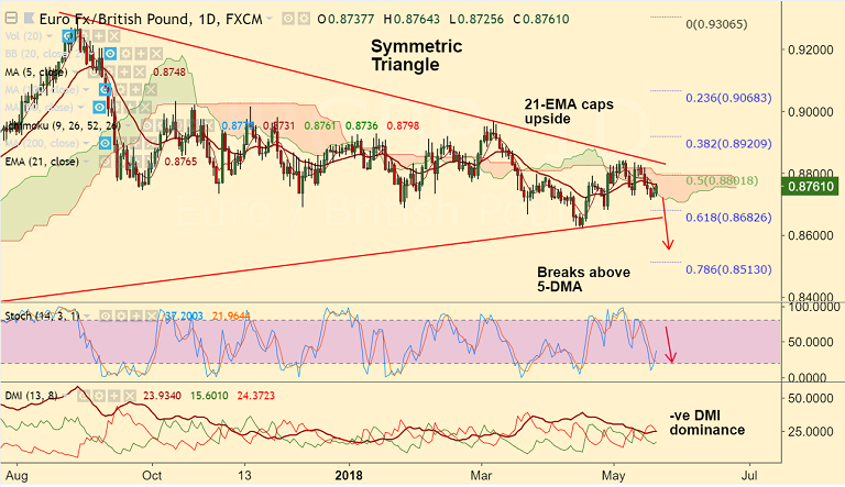 Support levels - 0.8748 (5-DMA), 0.87, 0.8682 (61.8% Fib), 0.8655 (Triangle base), 0.8620 (Apr 17 low)