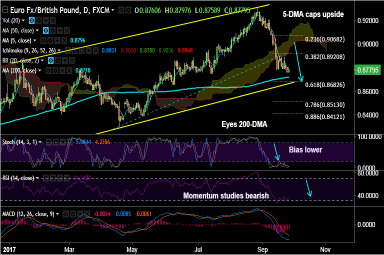 - Recovery in the pair was capped at 5-DMA at 0.8795, the pair is currently trading around 0.8776.