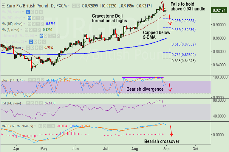 - EUR/GBP remains capped below 5-DMA at 0.9230 after failure at 0.93 handle, intraday bias bearish.