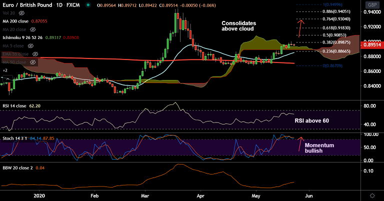 Oscillators are at overbought with scope for rollover. However, MACD and ADX support upside in the pair.