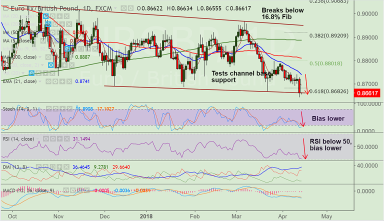 - EUR/GBP is testing channel base support at 0.8660, breach there will see further weakness.