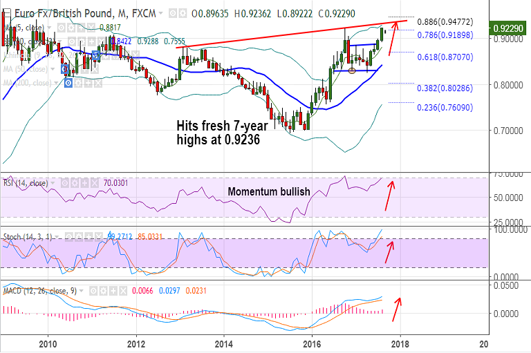 - EUR/GBP extends surge, hits 7-year highs at 0.9236 before paring some gains to currently trade at 0.9230.
