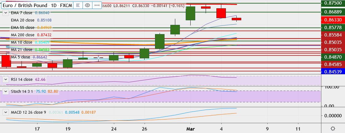 - On the downside, support is seen at 0.8594 (7-EMA), a break below could drag it till 0.8581.
