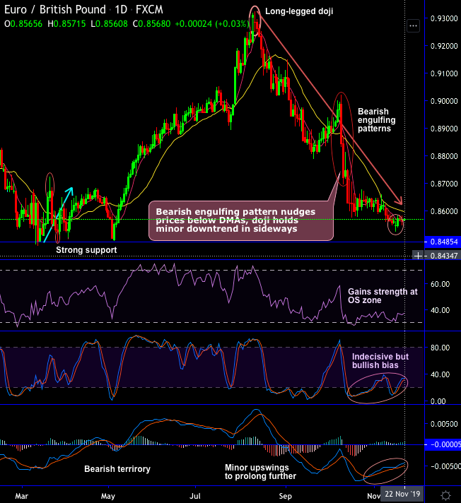 EURGBP minor trend has been grinding lower ever since the formation of bearish engulfing patterns at 0.8841 and 0.8719 levels that signaled weakness at the peaks of rallies, consequently, bears were back in action to plummet the prices below DMAs with bearish MACD crossover.