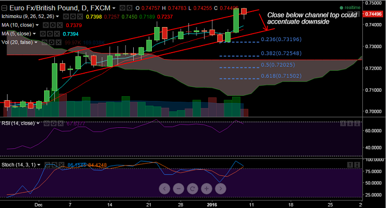 - A close below channel top 0.7454 will see downside upto 0.7393 levels and further below to 0.7360.