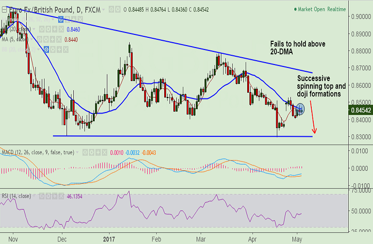 - EUR/GBP fails to hold gains above 20-DMA on two successive sessions, we see little support on the downside till 0.83 levels.