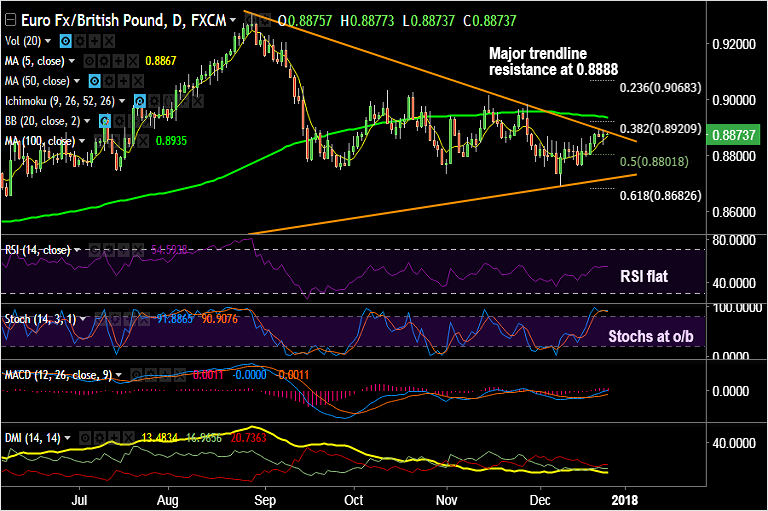 - Breakout at trendline will see upside till 100-DMA at 0.8935. Stochs are at overbought levels and hence keep chance for a correction.