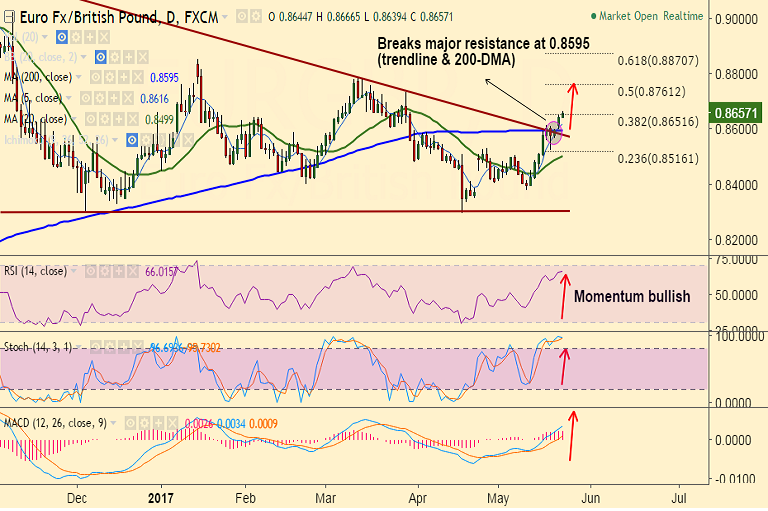 - The pair is extending gains after breakout above major resistance at 0.8595 (converged 200-DMA & trendline).