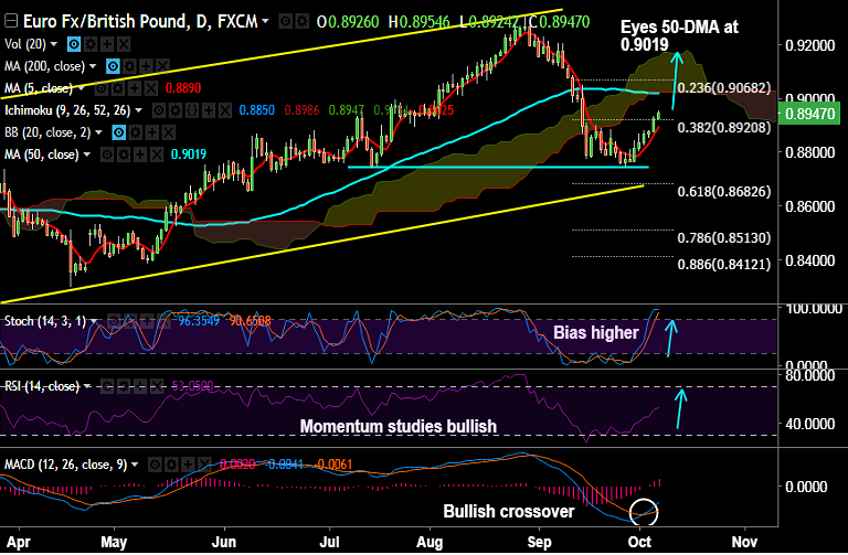 - Technical studies support upside in the pair, we see scope for test of 50-DMA at 0.9019.