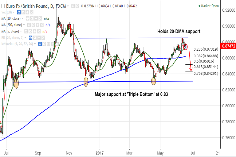 Support levels - 0.8724 (20-DMA), 0.8648 (38.2% Fib of 0.8297 to 0.8866 rally), 0.8614 (200-DMA)