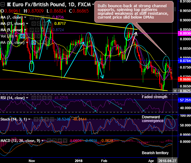 Bulls bounce-back at strong channel supports, on the contrary, the pair forms spinning top at the stiff resistance of 0.8784 levels.