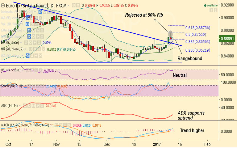 - EUR/GBP rejected at 50% Fib of 0.9225 to 0.8304 fall at 0.8765.