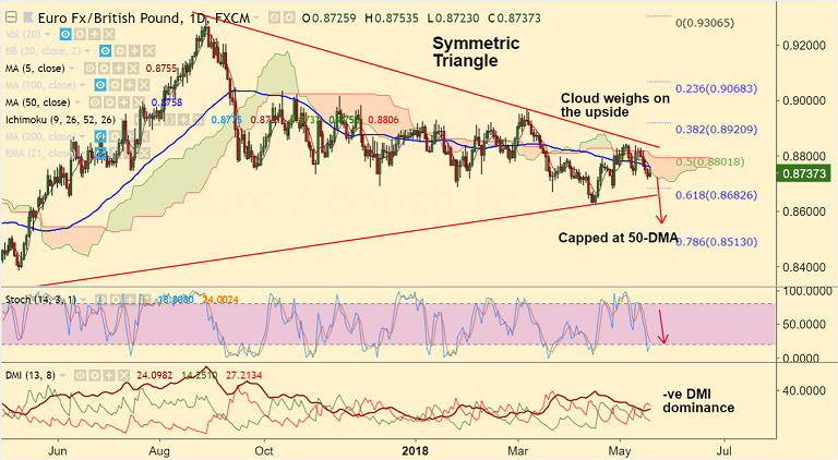 - EUR/GBP recovery was rejected at 50-DMA, the pair slips lower from session highs at 0.8753.
