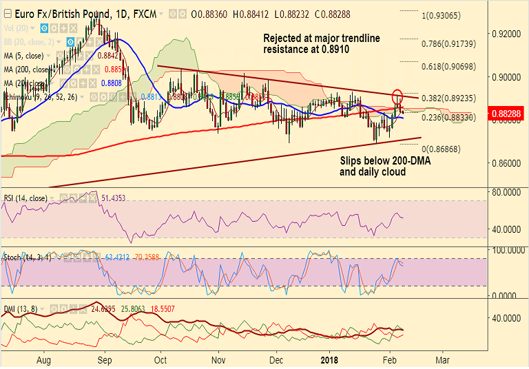 Support levels - 0.8808 (20-DMA), 0.8716 (Feb 1 low), 0.8686 (Jan 25 low)
