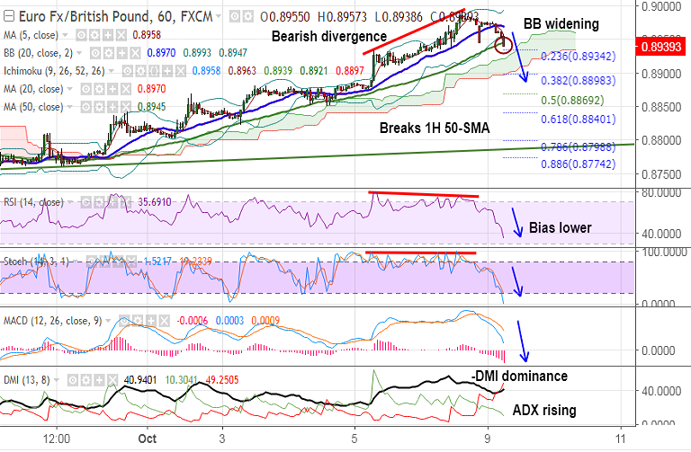 - On the hourly charts, the pair has broken below 50-SMA and technical indicators support downside.