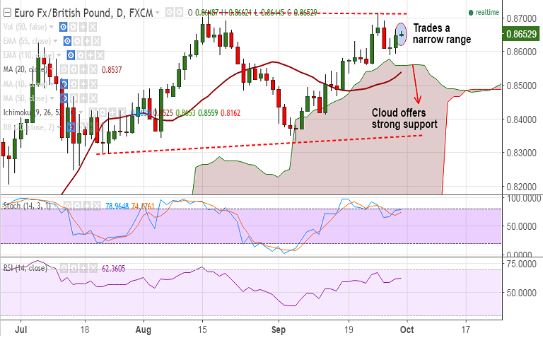 - The pair holds above daily cloud and 20-DMA is strong support at 0.8537.