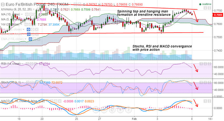 EUR/GBP has halted uptrend from 0.7526 lows, has retraced after hitting strong trendline resistance at 0.7710 levels.