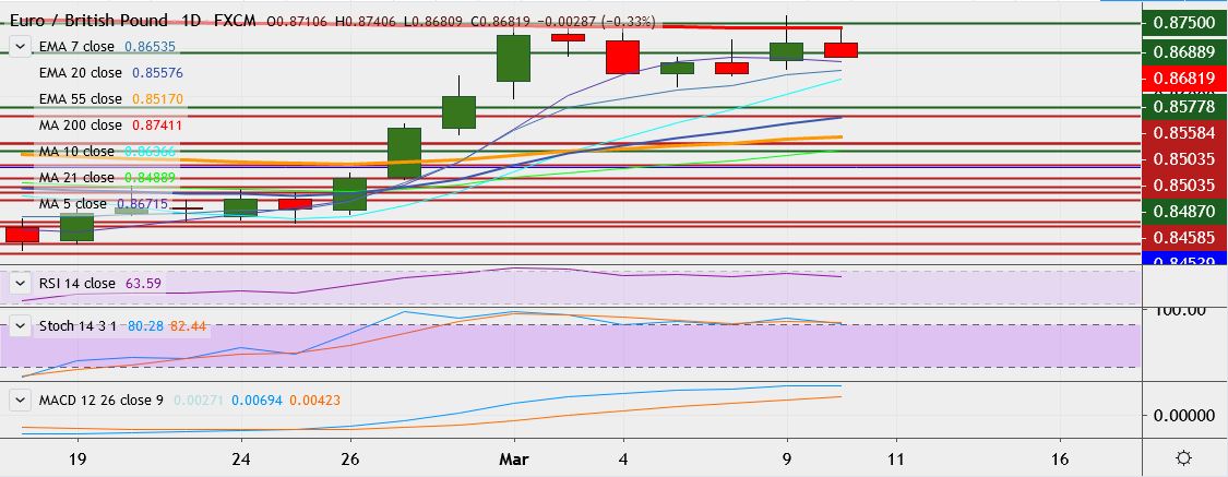 - On the downside, support is seen at 0.8670, a break below could drag it till 0.8644 (7-EMA).
