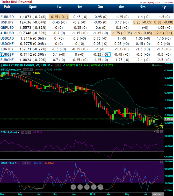 While EOD technical charts have shown some recovery from last week's lows at 0.6949 levels. Intraday sentiments are sideways to slightly bearish bias and leading indicators fortify these sideway swings with stagnant convergence. Things seem like taking track back onto its usual business on euro side, the euro continue to freezing its long lasting loses against sterling and held sturdy in early Asian trades today. If we have to infer from delta risk reversal nutshell, for next 3 months it would be little bias towards euro side.