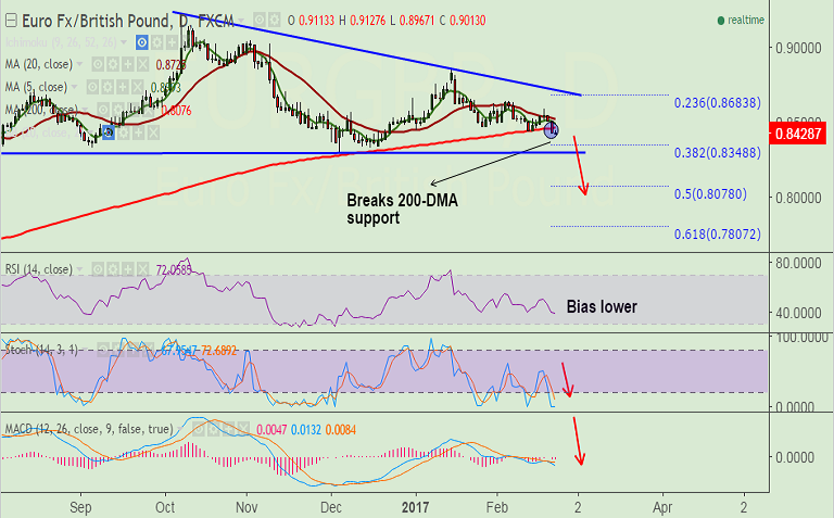- EUR/GBP trade which had been capped between 20 & 200 day MAs has shown a break below 200-DMA.