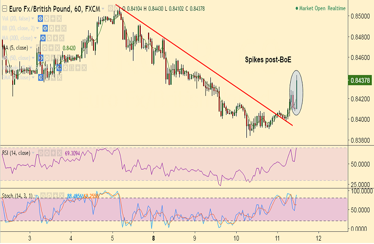 - EUR/GBP hit session highs at 0.8443, close above 20-DMA could see gains upto 0.8529 (upper BB).