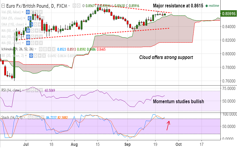 - On the flipside, dip into daily cloud could drag the pair lower to 0.8468 (Sept 15 low) and further weakness could see test of 50-DMA at 0.8493.