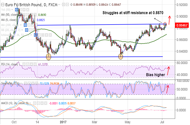 - The pair needs a decisive break above to extend upside. Break above 0.8870 will see next bull target at 0.90 and then 0.9050.