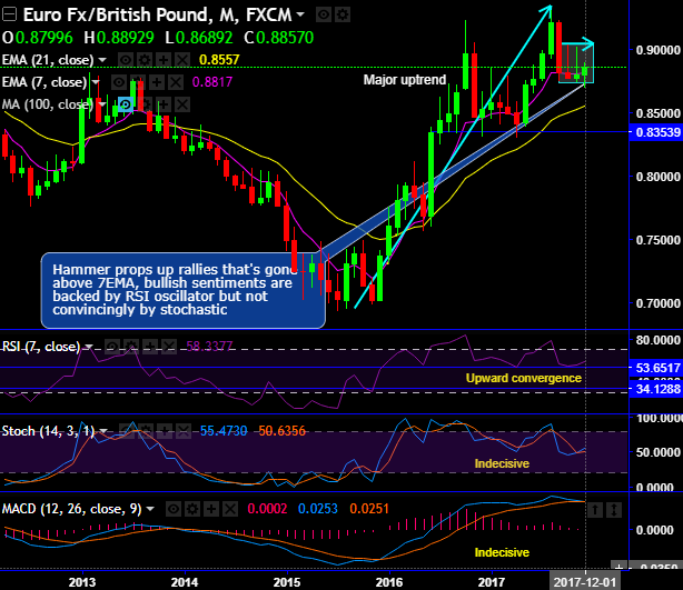 Contemplating all these factors, we could foresee the cross retains a mild bull bias for a gradual but choppy move towards the 0.8950-0.9025 range highs. Currently, pair pops up with bearish patterns such as shooting stars on monthly plotting.