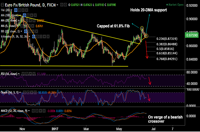 Support levels - 0.8731 (20-DMA), 0.8648 (38.2% Fib of 0.8297 to 0.8866 rally), 0.8616 (200-DMA)