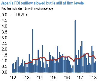 Also, Japan’s net outflow of FDI in 1Q was worth ¥3.6trn. This was 40% smaller than last year but still large in absolute terms (refer 1st chart).