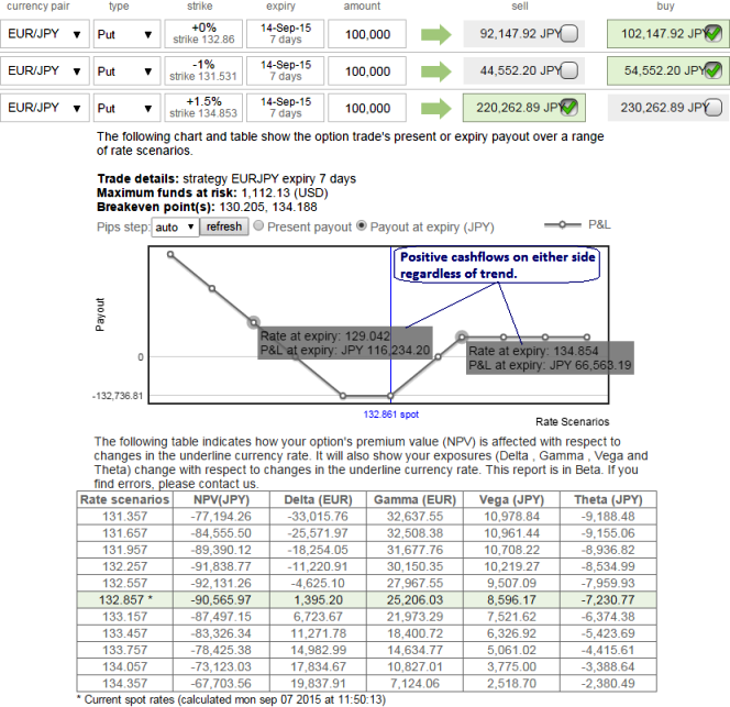 What does this strategy do with current trend: Since the short put ladder is an unrestricted return with partial risk bearing strategy that is deployed because in addition to the puzzling uptrend in short term and downtrend in long-term, we think that the EURJPY would also perceive significant volatility in the near term and delta risk reversal for next 6 months are suggesting downside hedging has been expensive due to selling pressure.