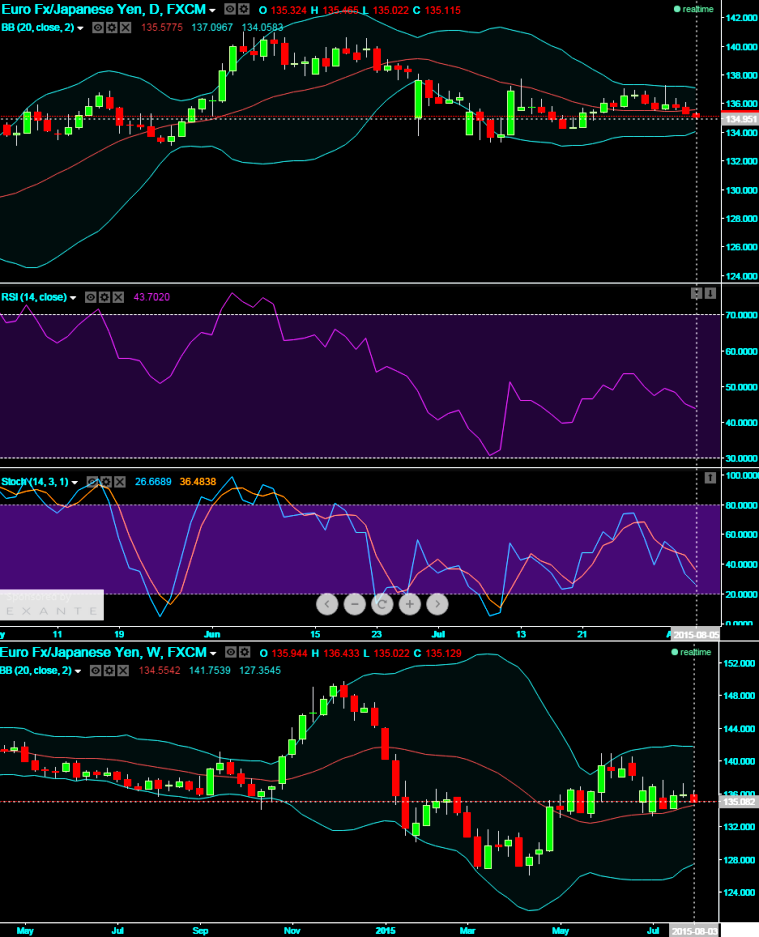 EUR/JPY is boiling up with lots of bearish candles, such as doji on weekly and candle resembling a shooting star on daily both occurred 135.985.