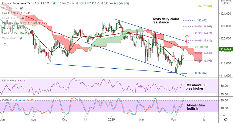 Summary: EUR/JPY is extending bullish streak for the 4th straight session. Momentum strongly bullish and volatility is high. Price action is has entered into daily cloud. Breakout at 110-EMA resistance will buoy prices. Scope for gains till 200-DMA at 119.25 ahead of 61.8% Fib at 119.63.