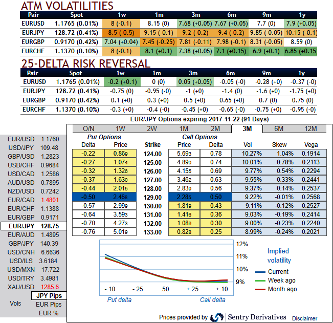 The steepness of the EURJPY risk-reversal curve renders back-end tenors better shorts, risk reversals have been bearish neutral. While positively skewed IVs towards OTM put strikes signifies hedgers’ bearish sentiments but puzzles prevailing uptrend of euro.