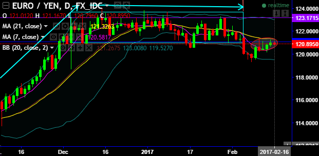 After inverse saucer on EURJPY, adjoining handle pattern is now on cards as interim bulls seem to be absolutely exhausted at 21EMAs (refer monthly charts).