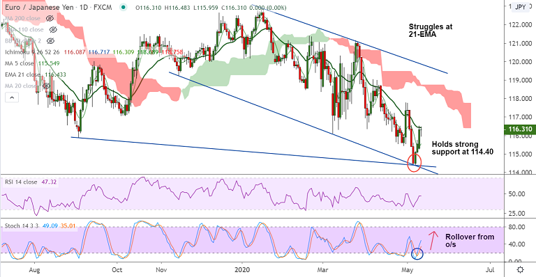 Breakout at 21-EMA will see further gains. Next major hurdle lies at 55-EMA at 117.62. Rejection at 21-EMA will negate bullish bias.
