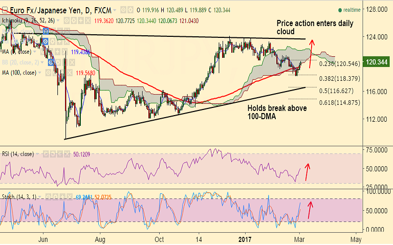 - EUR/JPY is extending upside after break above 100-DMA at 119.51 on Wednesday's trade.
